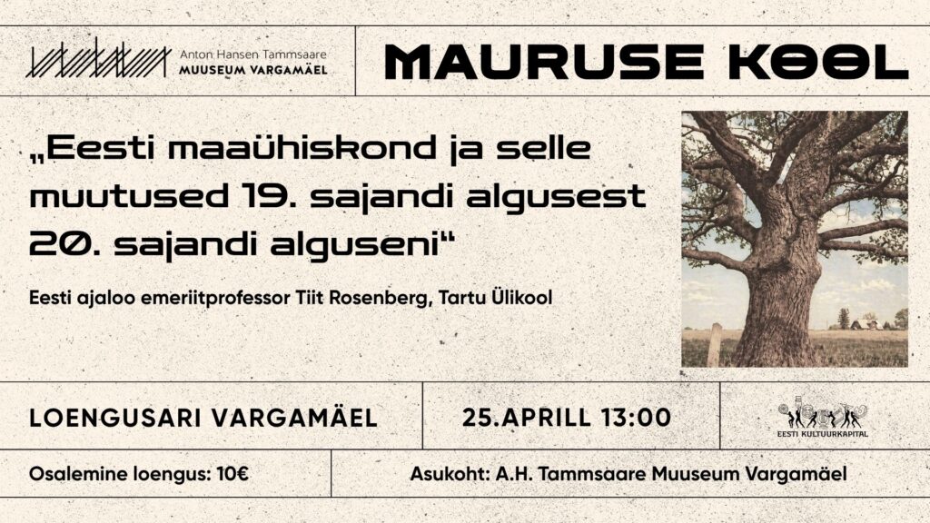 Эстонское сельское общество и его изменения с начала XIX века до начала XX века. 25 апреля, 13.00. 2026 год отмечает исключительную веху в истории культуры Эстонии — исполняется сто лет со времени первого издания первой части великого произведения Anton Hansen Tammsaare «Правда и справедливость». В честь юбилейного года приглашаем вас принять участие в особом цикле из четырёх лекций, где признанные преподаватели помогут понять обстоятельства эпохи «Правды и справедливости», дух времени, а также жизнь и творчество Tammsaare. Первая лекция посвящена крестьянскому обществу и отношениям земельной собственности с начала XIX века до начала XX века, разъясняет такие понятия, как saunikud, asunikud, popsid и vabadikud, и анализирует права и обязанности, связанные с владением землёй. В центре внимания — общественные отношения и центральная роль земли в формировании общественной структуры и ценностей. Лекцию читает почётный профессор истории Эстонии Тартуского университета Tiit Rosenberg, cand. hist. Многолетняя исследовательская работа профессора Rosenberg имеет фундаментальное значение для осмысления истории развития эстонской сельской жизни и сельского хозяйства. Его научный охват простирается от поместного хозяйства переходного периода и процесса выкупа крестьянами своих хуторов до поселенческой деятельности в эпоху независимости и сложных земельных реформ конца XX века. Выступление Tiit Rosenberg даёт редкую возможность увидеть литературное Vargamäe через строгий исторический фильтр и понять причины, лежащие в основе нашей национальной идентичности и развития сельской жизни. Начало в 13.00. Продолжительность лекции — 1,5 часа. Лекция проходит в музейном каряталли музея Vargamäe, на родине писателя, в деревне Vetepere. Билет можно купить в музее или на Fienta. Плата за участие — 10 евро. Цикл лекций поддерживает Eesti Kultuurkapital. За бодрящие напитки и домашнюю выпечку отвечает хутор Tammsaare-Lõuna. Оплатить можно как наличными, так и картой. От теории к практике: открывательское путешествие по культурному ландшафту Vargamäe. После лекции профессора Rosenberg мы сменим аудиторию на непосредственный опыт. Приглашаем вас на двухчасовую весеннюю прогулку по землям Tammsaare, где куратор музея Siiri Kvell раскроет социально-экономические слои наследия Tammsaare прямо в ландшафте. Маршрут проходит по старой зимней дороге и вдоль краёв канав к реке Jägala, сосредотачиваясь на истории границ и землепользования. Мы узнаем, как возникли сенокосы и пастбища хуторов и какие следы оставили мелиоративные работы в памяти нашего ландшафта. Просим участников одеться по весенней погоде и выбрать влагостойкую обувь. Участие в весенней прогулке входит в стоимость мероприятия. Ориентировочное начало кураторской прогулки — в 15.00.
